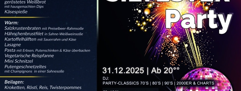 Erlebe einen unvergesslichen Abend mit einem festlichen Silvesterbuffet und einer mitreißenden Party mit DJ – die perfekte Kombination aus Genuss und guter Stimmung.